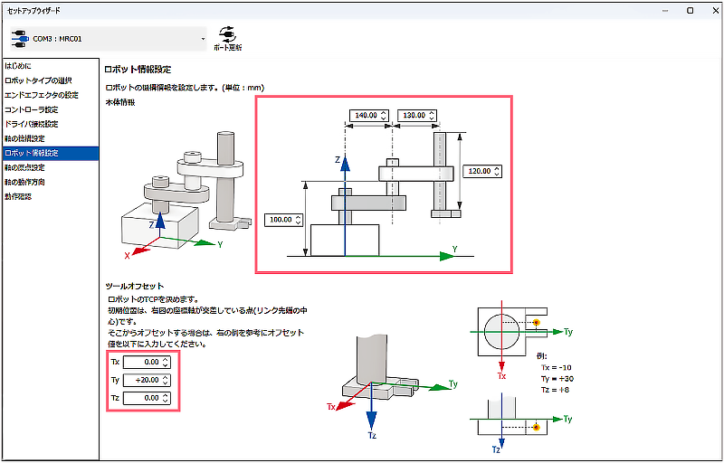 ウィザードメニューに従ってロボットの初期設定をすすめます。ロボットのイラストを見ながら、アームの長さなどの寸法を入力