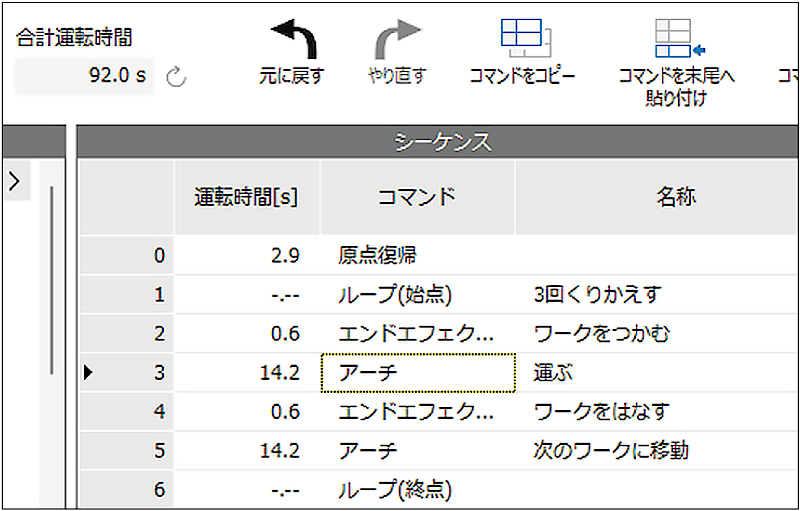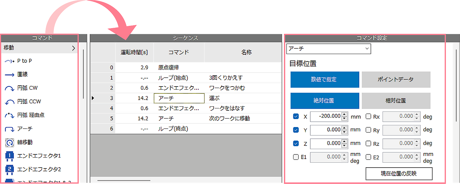 必要なコマンドをドラッグ&ドロップ 目標位置や速度を設定 「コマンド」欄から必要な動作を選んで、「シーケンス」欄にドラッグ&ドロップすると、「コマンド設定」欄が表示されます。 目標位置の座標・移動量の指定、速度をコマンド設定欄に入力します。