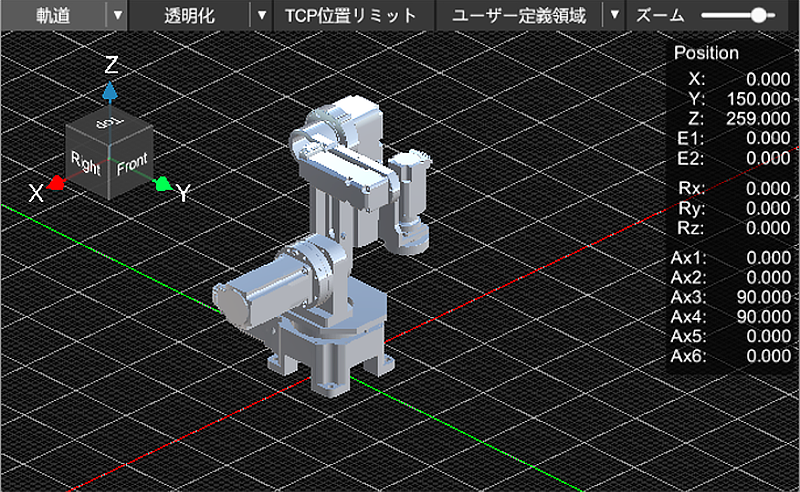 3D グラフィック上で、実機を動かさずに動作を確認することが可能です。※ シミュレーションと実機の動作は差異が生じる可能性があります。