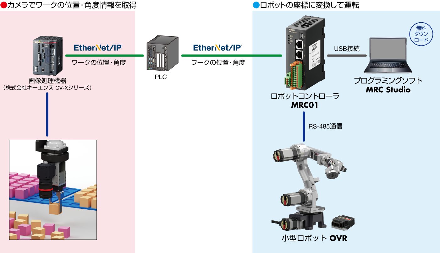 ロボットコントローラ MRC01 は、カメラで取得したワークの位置や角度の情報を使って、ロボットを運転させるための便利な機能を搭載しています。