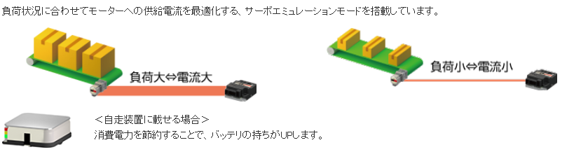 バッテリ電源にも対応しています。AZシリーズ DC電源入力のモーターと、それらを搭載している電動アクチュエータを接続できます。