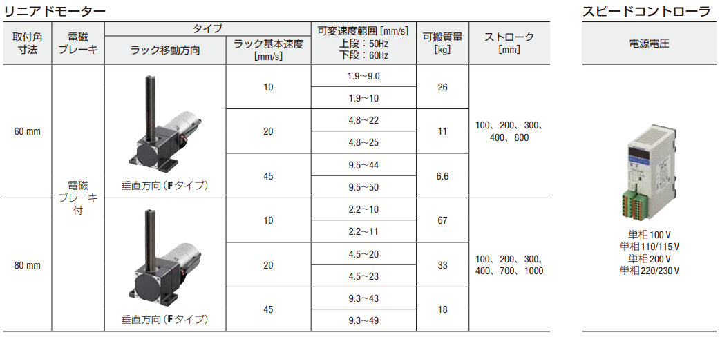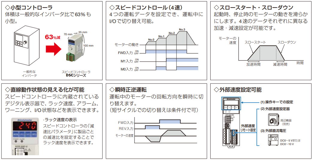 ラック・ピニオン機構とACスピードコントロールモータを一体化。DSCシリーズを搭載し、リーズナブルに速度制御を実現します。ラック・ピニオンシステムは、モータの回転運動を直線運動に簡単に変換できます。 直動機構部はコンパクトな設計ながら、高強度加工を施していることにより、大きな負荷を搬送することができます。