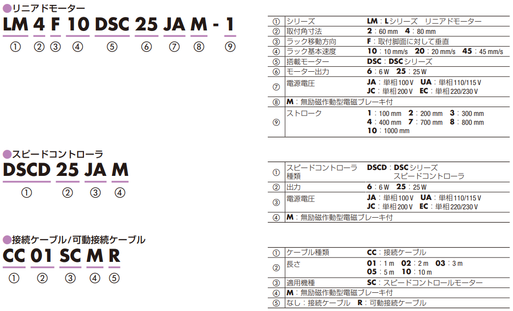 (「スペックで絞り込む」から画面遷移すると、リニアドモータ、スピードコントローラ、接続ケーブル、それぞれを「+」でつなげた品名が候補表示されます。)