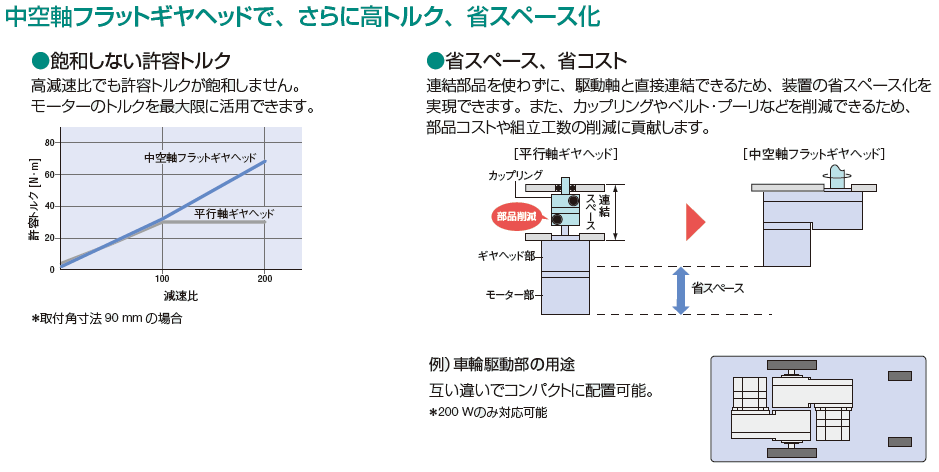 別売のフランジ出力ヘッド(AGD580B)を平行軸ギヤヘッドに後付けすると、ギヤヘッドだけの場合よりも許容ラジアル荷重と許容アキシアル荷重が大幅にアップします。