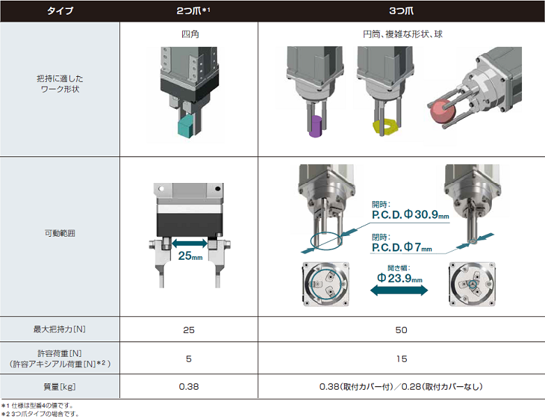 | 3つ爪タイプは、球体や円筒・円柱の 把持が可能。 ![]() |