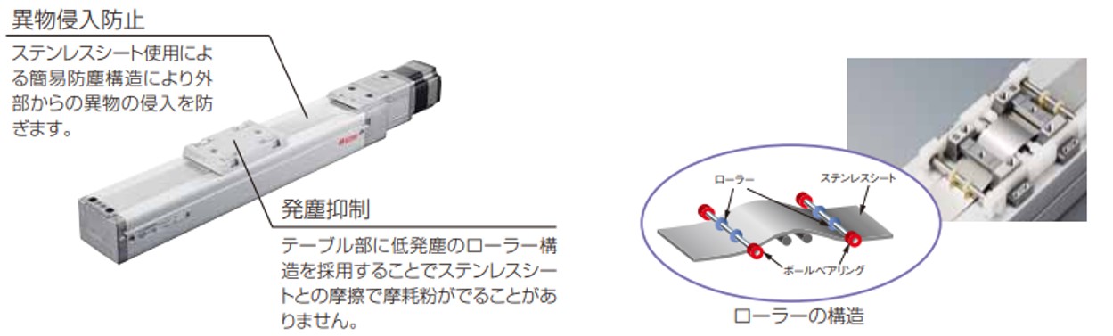 テーブル部にステンレスシートとローラー構造を採用した簡易防 塵構造によって異物の侵入を防止し、発塵も抑制します。テーブル部に低発塵のローラー構造を搭載し、ステンレスシート と転がり接触することで、摩耗粉の発生を防ぎます。 発塵を抑え るだけでなく、ステンレスシートの耐久性向上につながります。