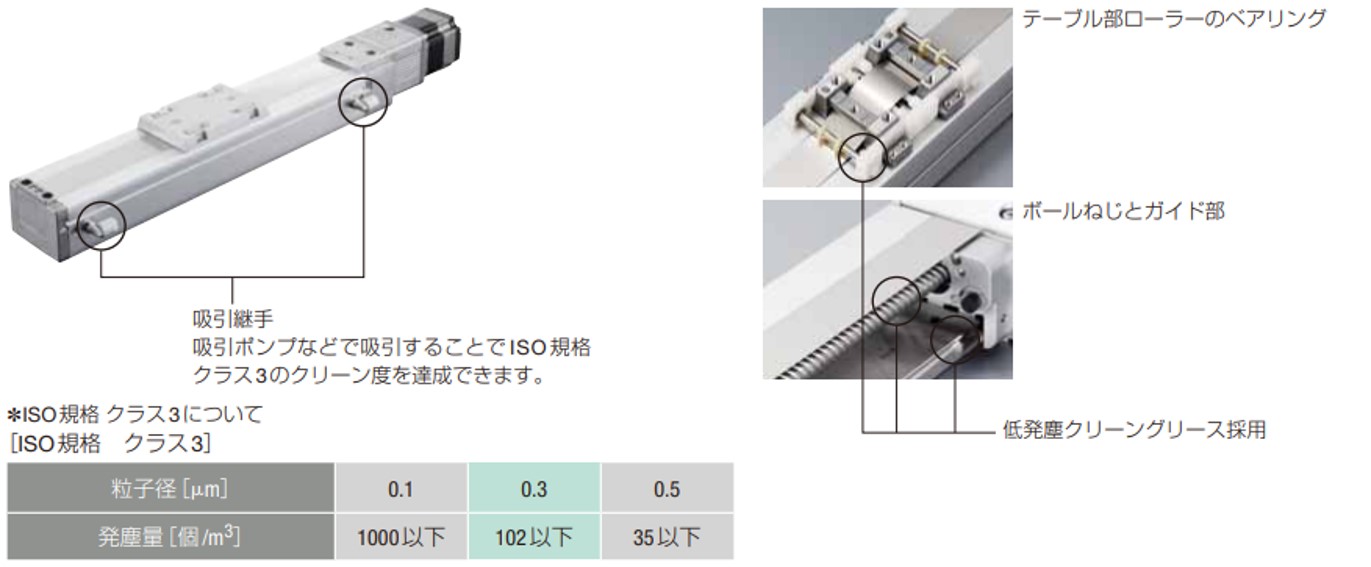 低発塵クリーングリース使用 ボールねじやガイド、ベアリングなどに低発塵クリーングリースを採用しています。
