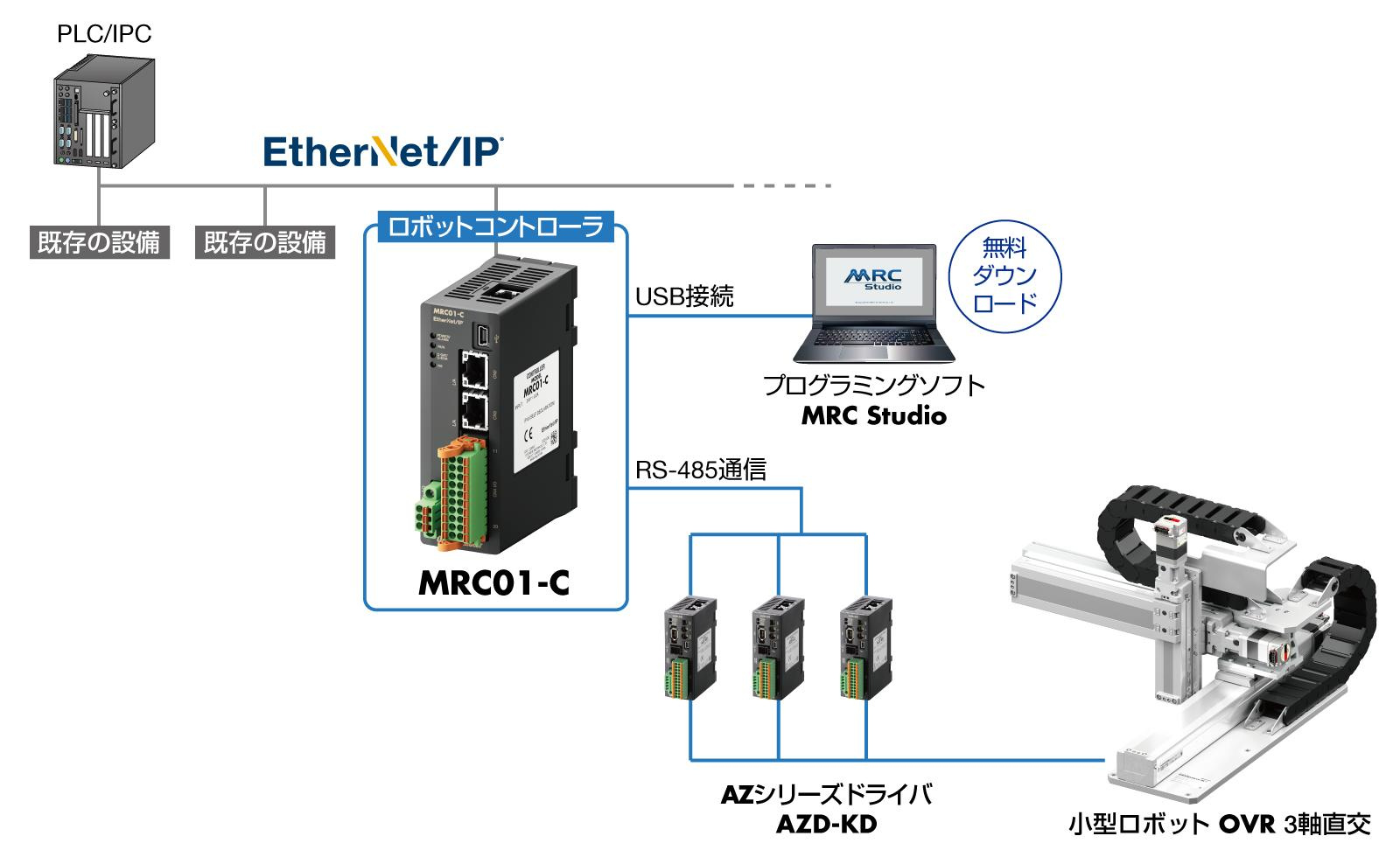 ロボットコントローラMRC01-CとプログラミングソフトMRC Studioを使用することで簡単にロボット制御が可能です。