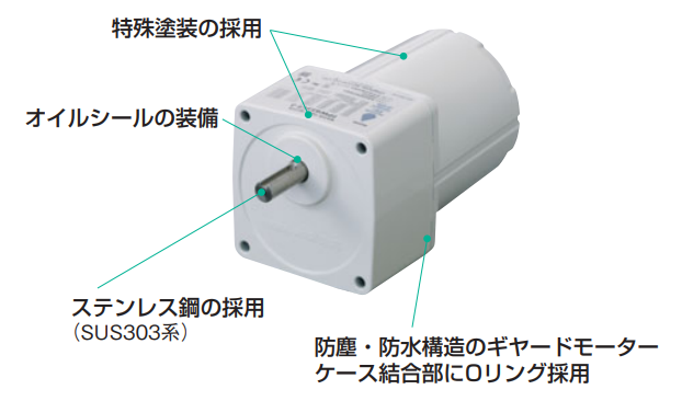 防塵・防水性 IP67 水がかかる場所でも使用できる防塵・防水タイプのギヤードモータです。出力25W、40W、60W、90Wをご用意しています。IEC規格のIP67に適合しています。 水中や水圧の高い環境でのご使用には適していません。