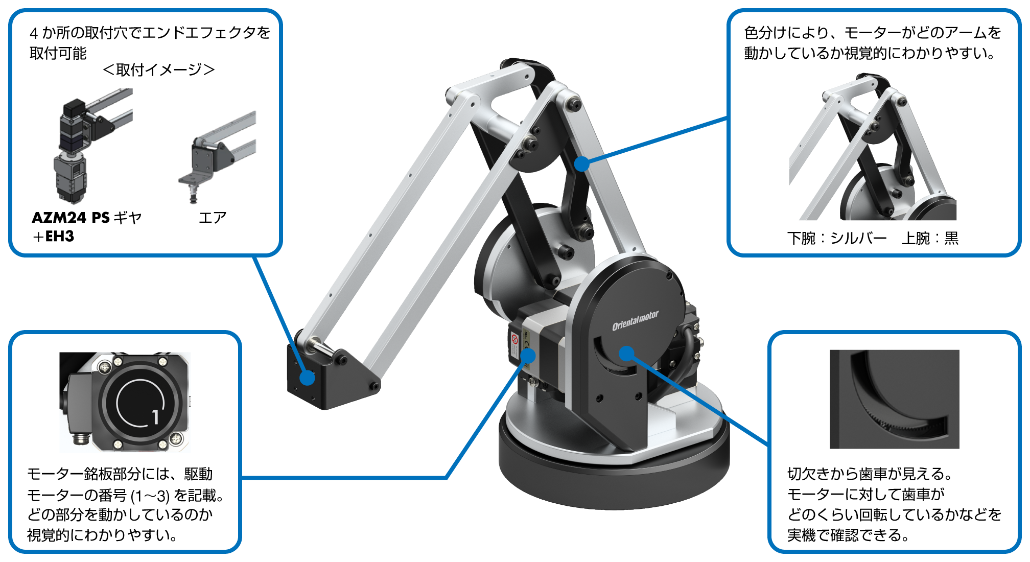 各軸のモーターには電磁ブレーキが付いていません。電源を切ると出力軸が無励磁となり、保持力が失われます。取り扱いに注意してください。ロボットアームの交換・カスタマイズやエンドエフェクタ組み換えが可能