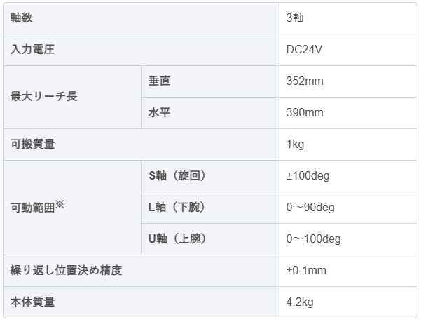 ●最大リーチ長(水平)390mm※、可搬質量1kg、繰り返し位置決め精度±0.1mm