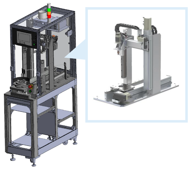 横幅わずか400mmの架台に直交ロボットと専用コントローラを搭載した自動化装置です。