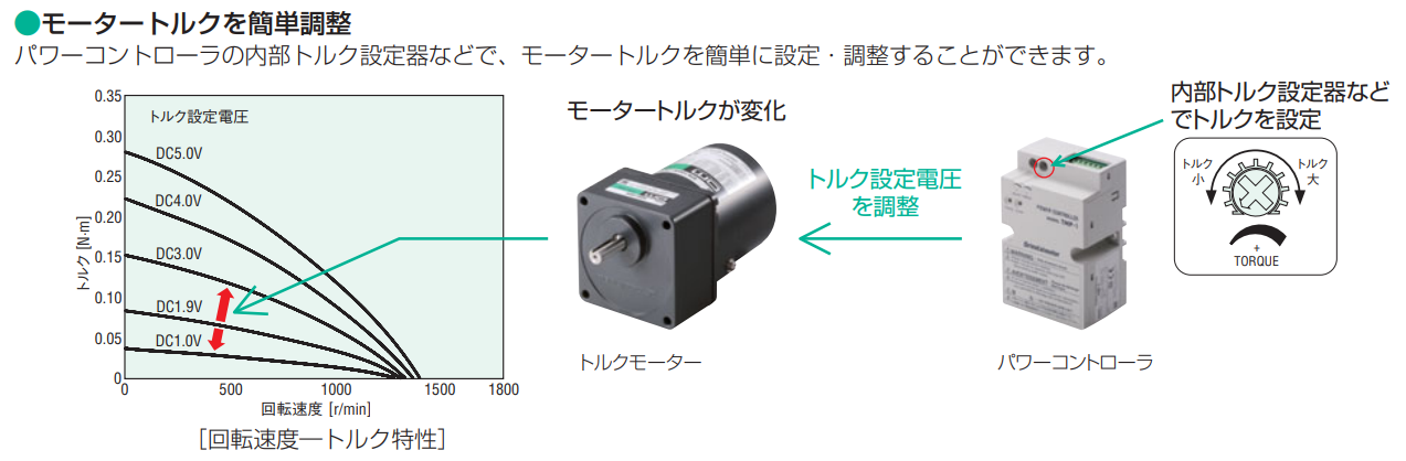 ●モータへの印加電圧を変えるだけで、トルク調整ができますトルクモータは起動トルクが大きく、垂下特性を有しています。