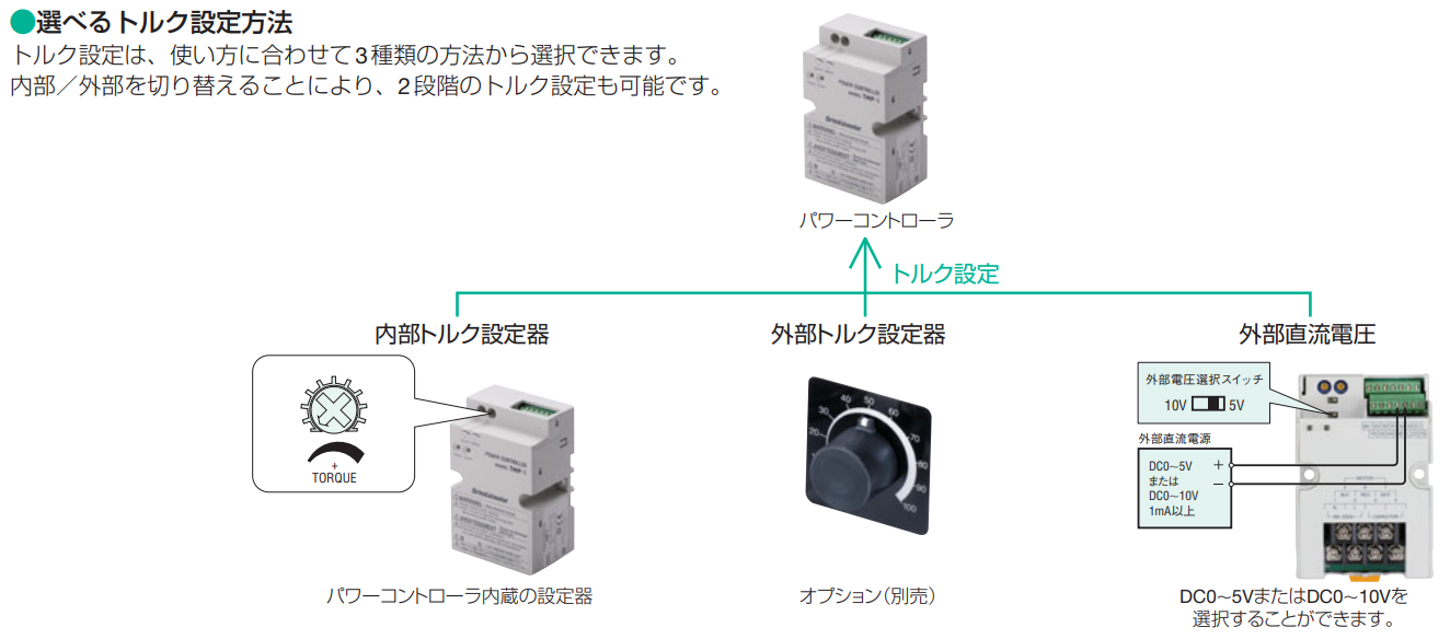 「内部トルク設定器」「外部トルク設定器」「外部直流電圧」からトルクの設定が可能です。外部直流電圧の場合、上位PLCと接続して直流電圧で制御でき、自動化にも貢献します。内部/外部を切り替えることにより、2段階のトルク設定も可能です。