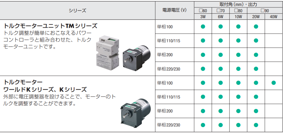 トルクモータは、インダクションモータやレバーシブルモータと異なり、拘束状態または拘束に近い低速運転でも、安定したトルクが得られるように設計されています。 そのため、物を押し付けるなど静止トルクが必要な用途や、工程の終わりに拘束状態になるような負荷の駆動に適しています。