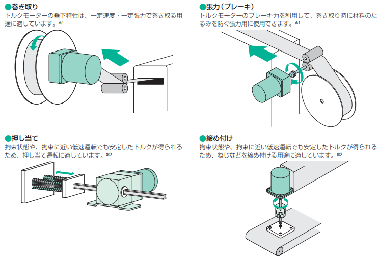 この特徴を活かし、巻き取りや張力用のモータとして幅広い用途でご使用いただけます。