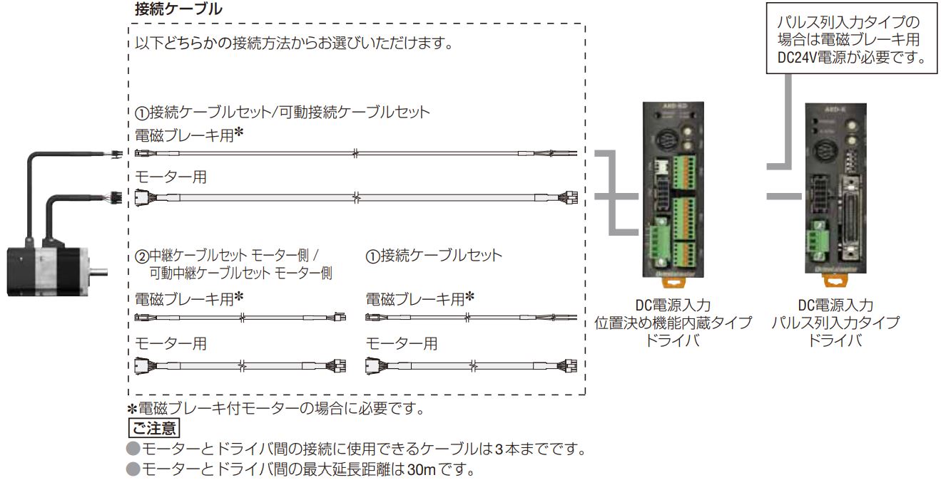 ご注意:モーターとドライバ間の最大延長距離は30mです(合計3本まで)
