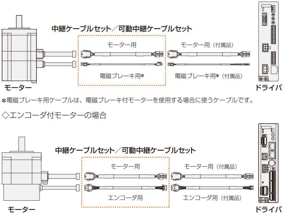 RK2シリーズは、モーターとドライバ間を接続するケーブルが付属しているタイプと付属していないタイプがあります。