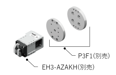 電動ハンド(品名:EH3-AZAKH)の取付例です。ISO9409準拠のフランジ(品名:P3F1)と合わせると簡単に装着することができます。