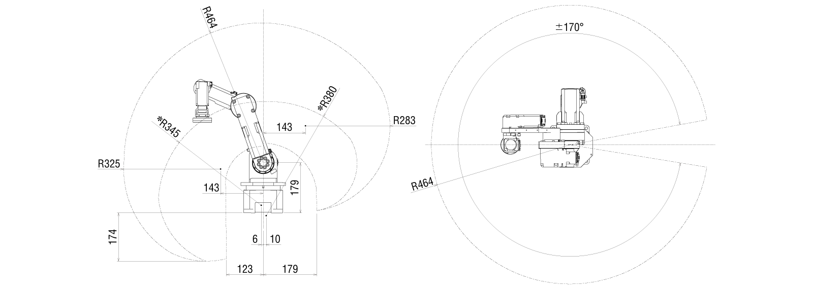 *の数字は手首軸を下向きにした場合のリーチ長を現わしています。