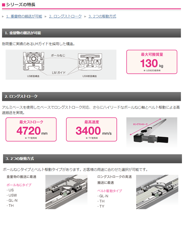 ボールリテーナ入りLMガイドSSR,SHSを採用した、軽量・高剛性のアクチュエータで、重量物の搬送に最適です。