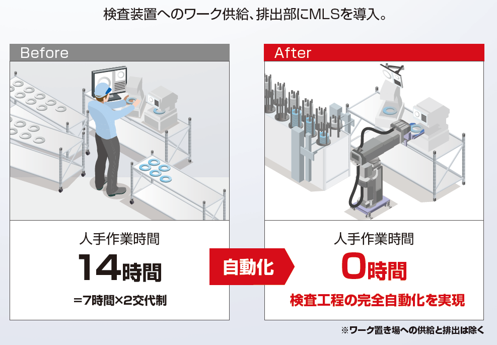 いままで人によるワーク供給、排出作業をMLSに変えることで、省人化、自動化を実現