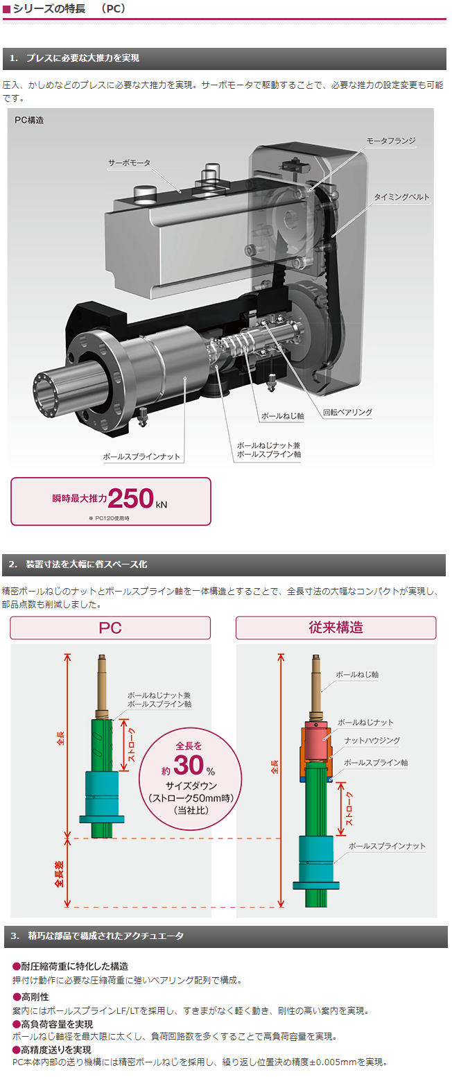 精密ボールねじのナットとボールスプライン軸を一体構造することで、全長の大幅短縮を実現し、装置の省スペース化に貢献いたします。送り機構には精密ボールねじを採用し、ACサーボモータにて駆動するため、高精度な動作が可能です。ベアリング配列や圧縮荷重に強い構造となっているため、精密プレス・圧入・かしめ等の用途に最適です。
