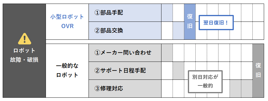 小型ロボットOVRは一部のモータ、部品が自社で交換可能なため、ロボットが故障停止してから復旧までの時間を短縮できる。