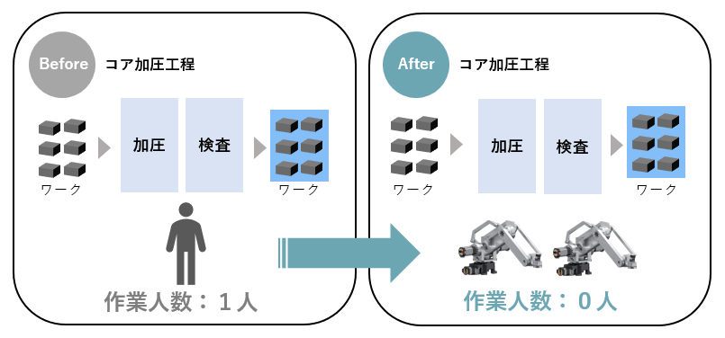 - 加圧装置へのワークの供給、加圧、検査、排出はすべて人がつきっきりで行なっていた。