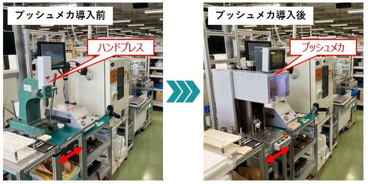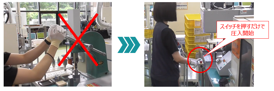 また、ハンドプレスで作業者が抱えていた、次のような悩みが解決。作業者にやさしいラインへと進化しました。