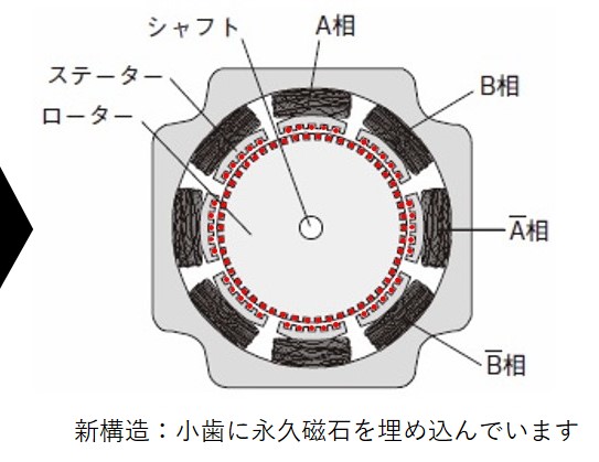 小歯に永久磁石を挿入したことから先端の磁束密度が増加するため、より効率的にトルクを発生できる構造になっています。