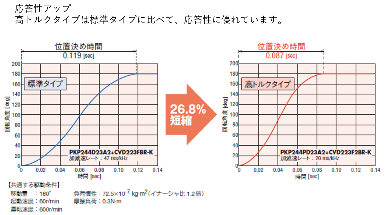 ・高応答:位置決め時間 26%の短縮(移動量180deg回転に対して0.087秒で位置決め運転が可能)