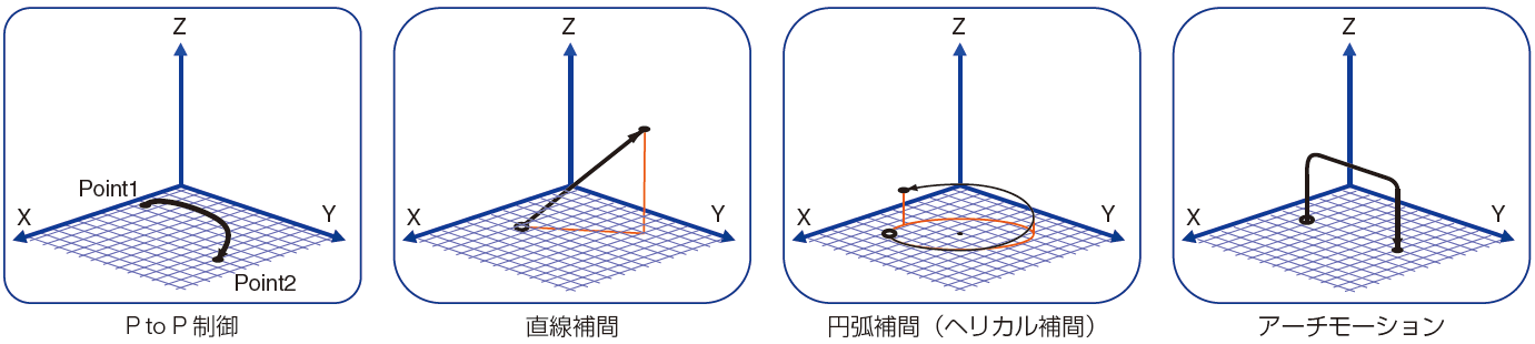 運転のコマンドはPtoP制御、直線補間、円弧補間(ヘリカル補間)、アーチモーションに対応。それぞれのコマンドで