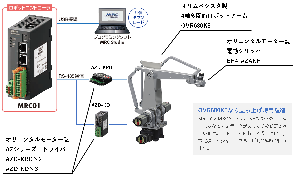 オリムベクスタ製4軸多関節ロボットアームとオリエンタルモーター製電動グリッパを使用しました。ロボットアームと