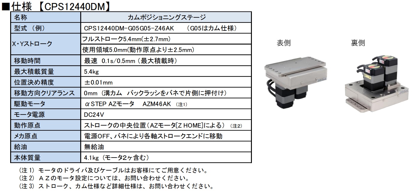 ストローク±2.7mm(X、Y軸とも)最大積載重量5.4kg、繰り返し位置決め±0.01mm