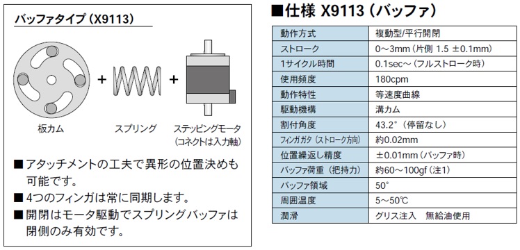 繰り返し精度の高いカムをベースに、リジットはバックラッシレス機構を採用。バッファはスプリングによるセンタリングバッファ機能で高精度な位置決めができます。シンプルでフィンガ駆動部に過負荷を与えない構造のため耐久性に優れ、長期にわたって使用できる経済性の高いアライメントユニットです。無限軌道リニアガイドの採用により、軽快で、こじれのない作動を実現。高速応答性に優れています。ステッピングモータの加減速制御により高速でもソフトな位置決めを実現します。