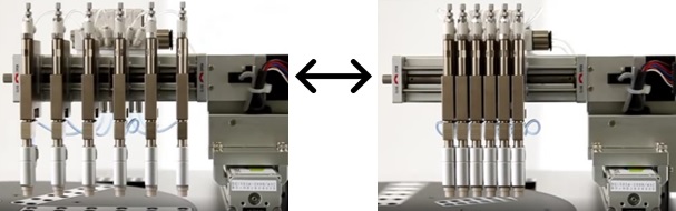 単純な2点間のピッチ変更で、複数の溝付プレートをエアシリンダで上下させ、溝に沿ってスライドプレートを開閉させる。