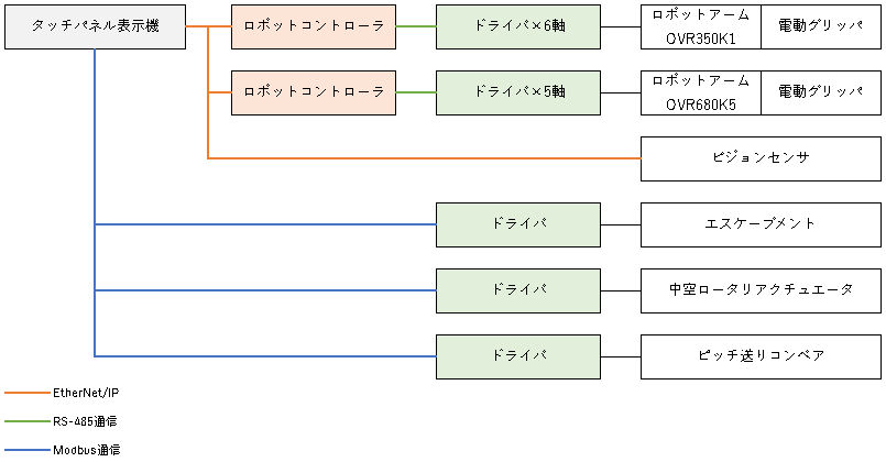 「ロボットは半完成品」と言われるように、ロボット単体で活用することはできず周辺機器も含めたFAシステムの構築が必要です。しかし、そのために発生するコントローラの選定・購入やプログラミング及びそれらの習得は担当者の負担になります。MRC01は周辺機器も含め最大7軸まで制御できるためこのような設計者の負担を軽減し、シンプルなFAシステムの構築に貢献します。具体的な事例をご紹介します。