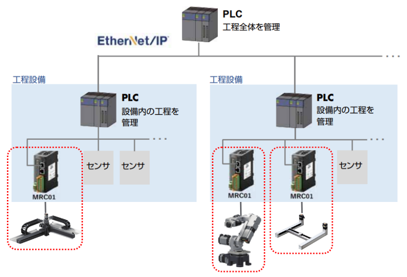 ロボットを含めたすべての機器をPLCで制御する場合、ロボットやその他周辺機器の動作プログラムを一度に作成する必要があり、PLC担当者の負担が大きくなります。一方MRC01はMRC Studioを使うことで、PLCを介さず単独で動作プログラムの作成・テストができます(下図赤点線内)。