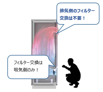 フィルター交換は吸気側のみ。フィルター、作業時間、作業コストも半分になる。