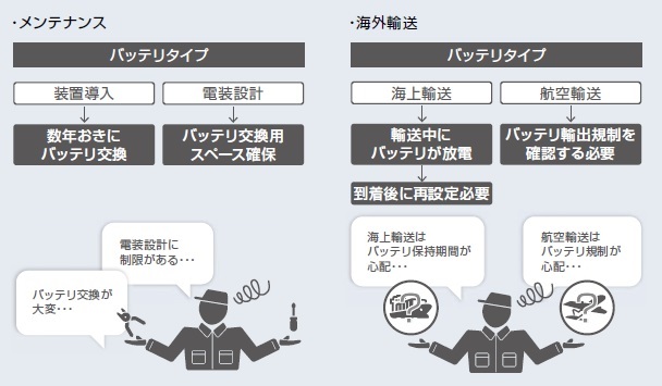 課題 バッテリ切れトラブルの解消、メンテナンスの手間を解消したい