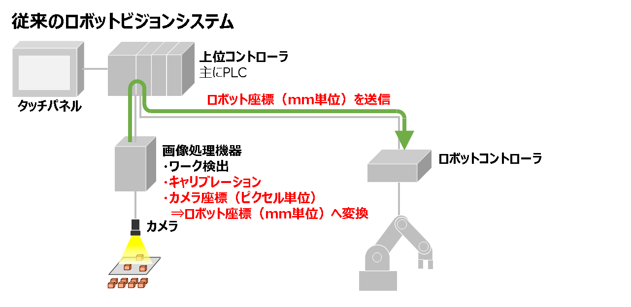 カメラの情報をロボットコントローラに転送するにはシステムの中に上位コントローラが必要です。